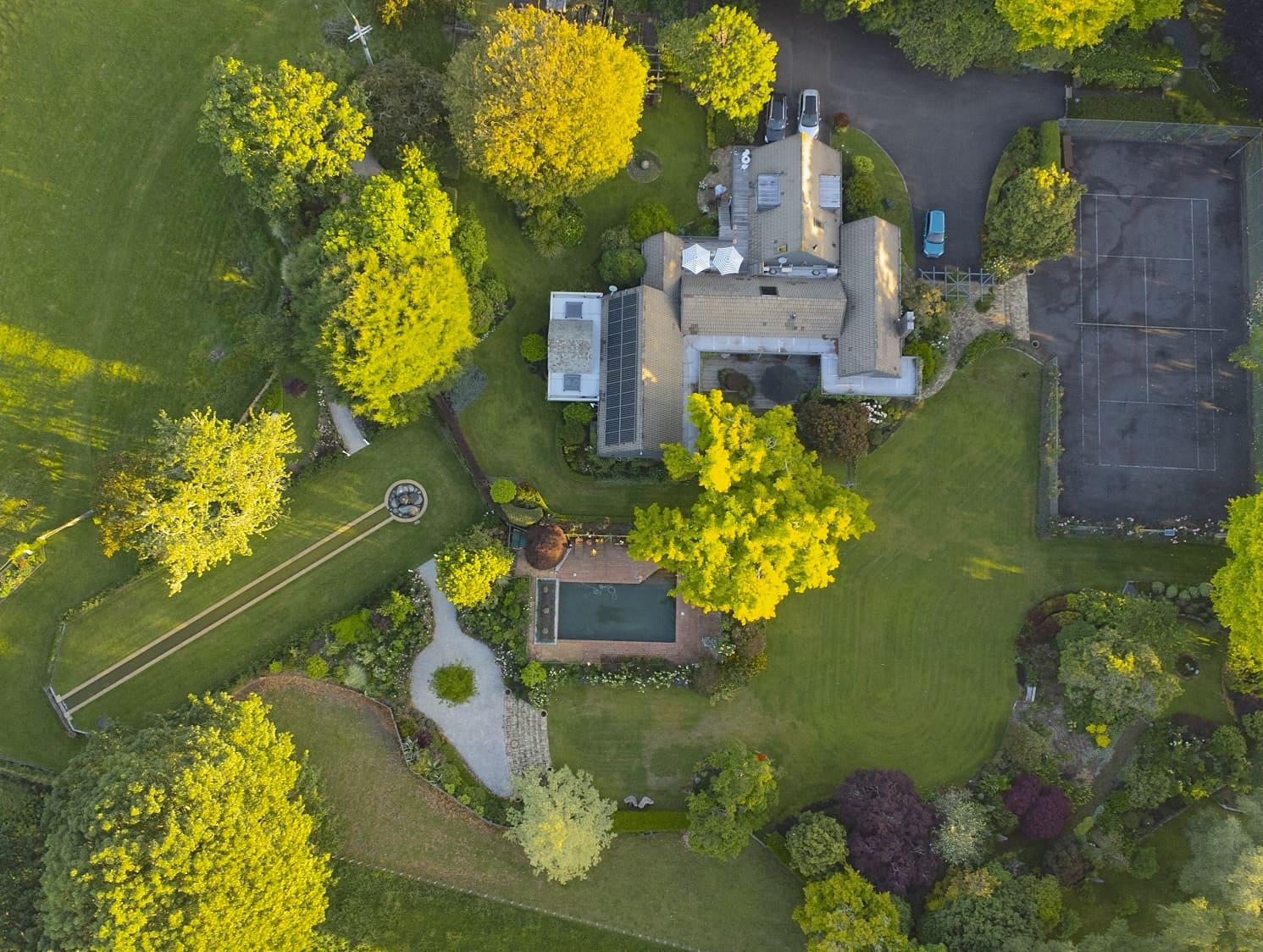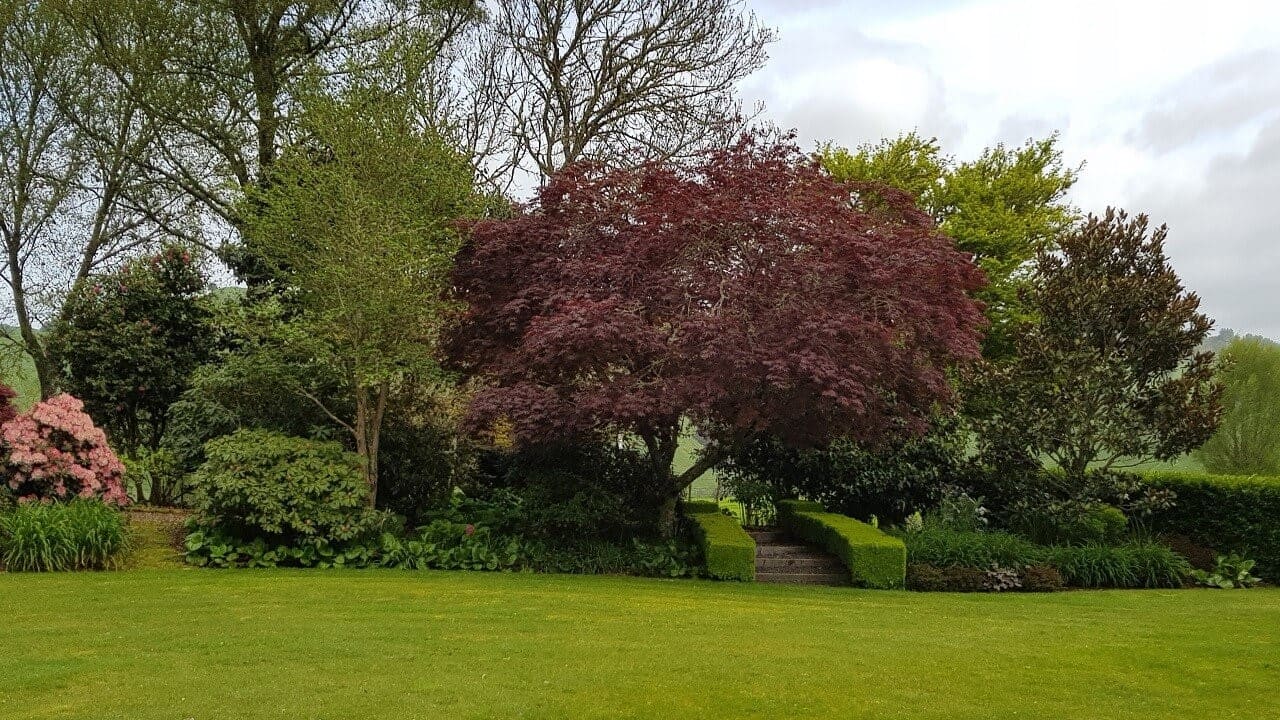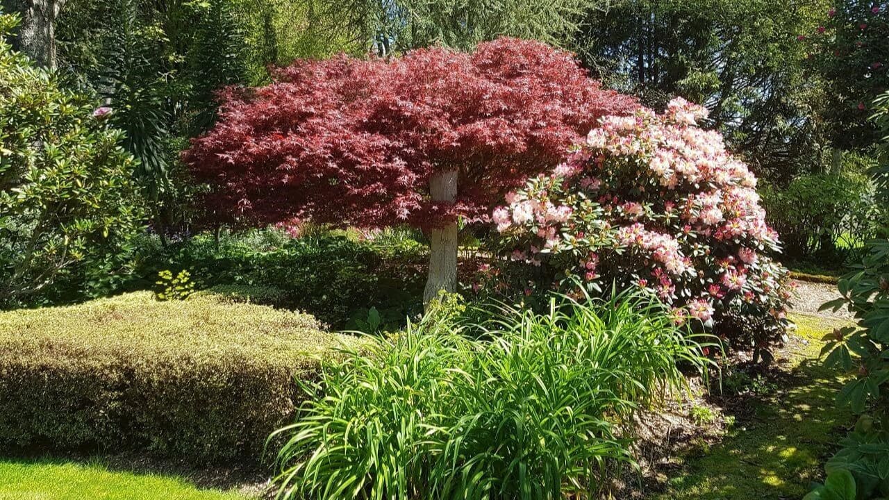 numerous large mature trees and a wide variety of plants,