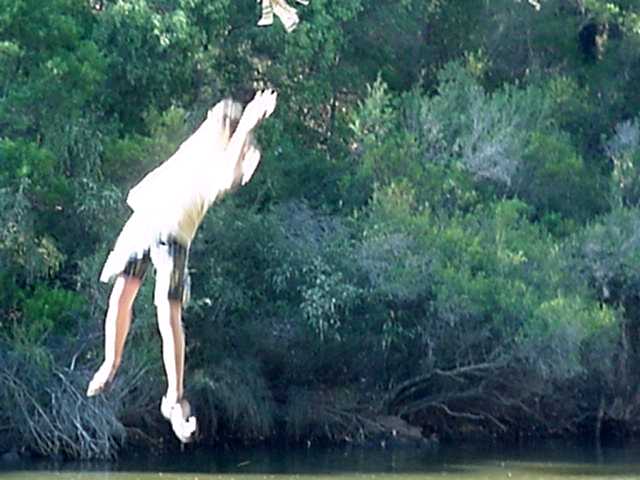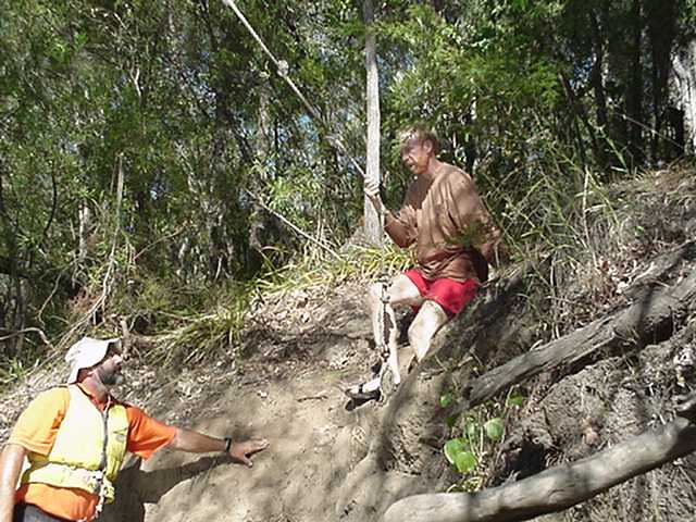 gets some last minute advice before taking the plungeEarly in the morning of day four we broke camp, and began paddling the remaining distance to the Margaret river haul-out spot. Time was a bit of an issue, as we were scheduled to visit a working sheep ranch early that afternoon. However, we did have time to pause at a rope swing about half way to our ultimate destination.  The swing deposited us about 10 meters from the river bank and about 2 meters or so above the water. It was an exhilarating way to get your morning shower. The photo below captures Derrick as he begins his plunge into the Blackwood River. In the photo to the right, Mr. Smith receives some last minute advice from Wally before having his encounter with gravity. The judges awarded him a "2."