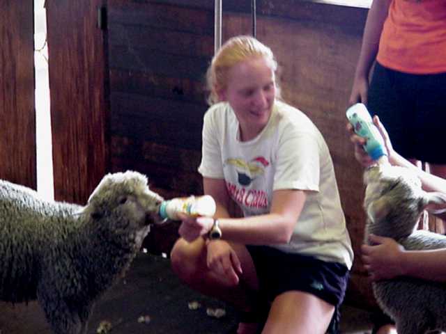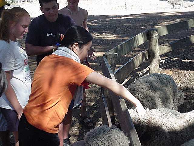 the sheepLindsay had a little lamb. . .We returned to the sheep shearing shed, and were treated to a demonstration of how the sheep are actually shorn. Holding the sheep by its front legs, the sheep shearer shaves off the entire coat of wool in one piece; the process takes less than a minute. The picture to the left shows a shearer in action. In the picture to the right, Lindsay feeds a baby lamb, while (below) Felipe and Joe learn how to handle the sheep as Alex (in the background) looks on nervously. The video below shows the sheep shearing process, courtesy of jagger3534.