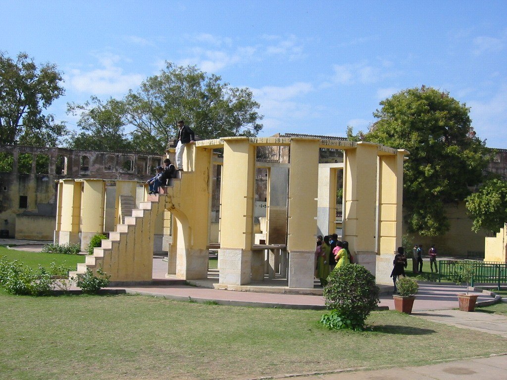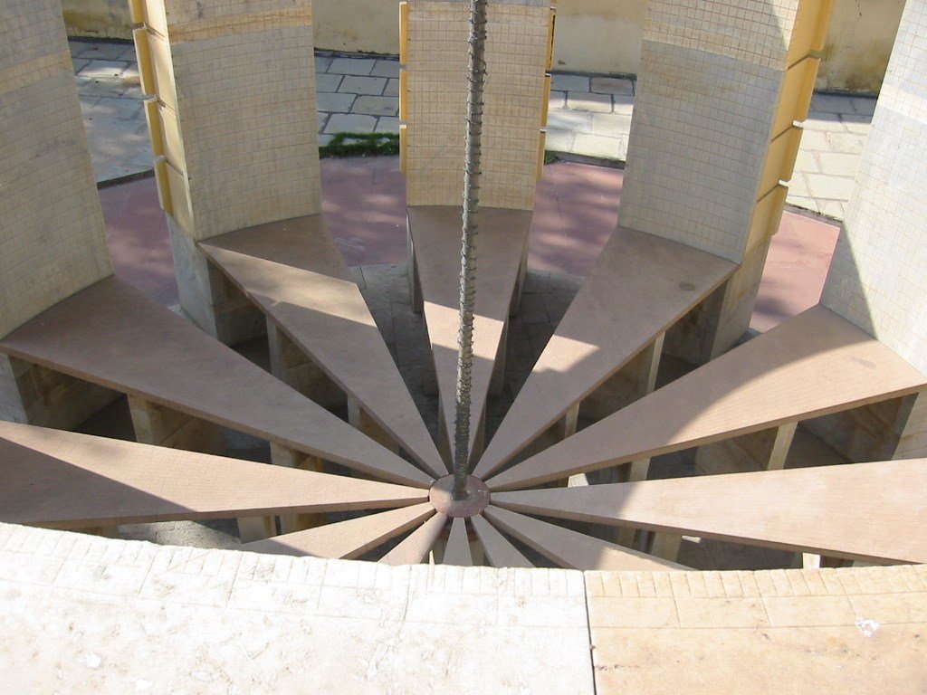 The Rama Yantra is a series vertical columns that support an equal number of horizontal slabs in two identical stone structures . The readings from these determine the celestial arc from horizon to zenith as well as the altitude of the sun. Again the scale of the devices helped ensure their accuracy. The use of the device is quite ingenuous--simply insert an iron rod into the center, and read the numbers off the incremental markings on the horizontal fans, the vertical columns, and the ring on the top. The fans or spokes on the two Rama Yantra instruments are complimentary. so that if the shadow falls between the spokes on one of the instruments, it can be read on the other. The photo to the left shows the larger of the two Rama Yantra instruments, while the photo to the right shows the interior of one of the Rama Yantra instruments, with the iron rod centered between the fans or spokes.