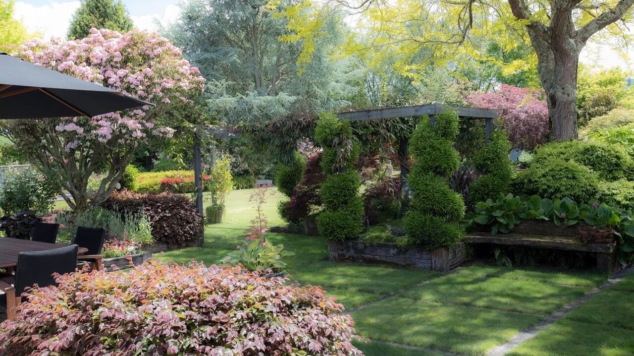 numerous large mature trees and a wide variety of plants,